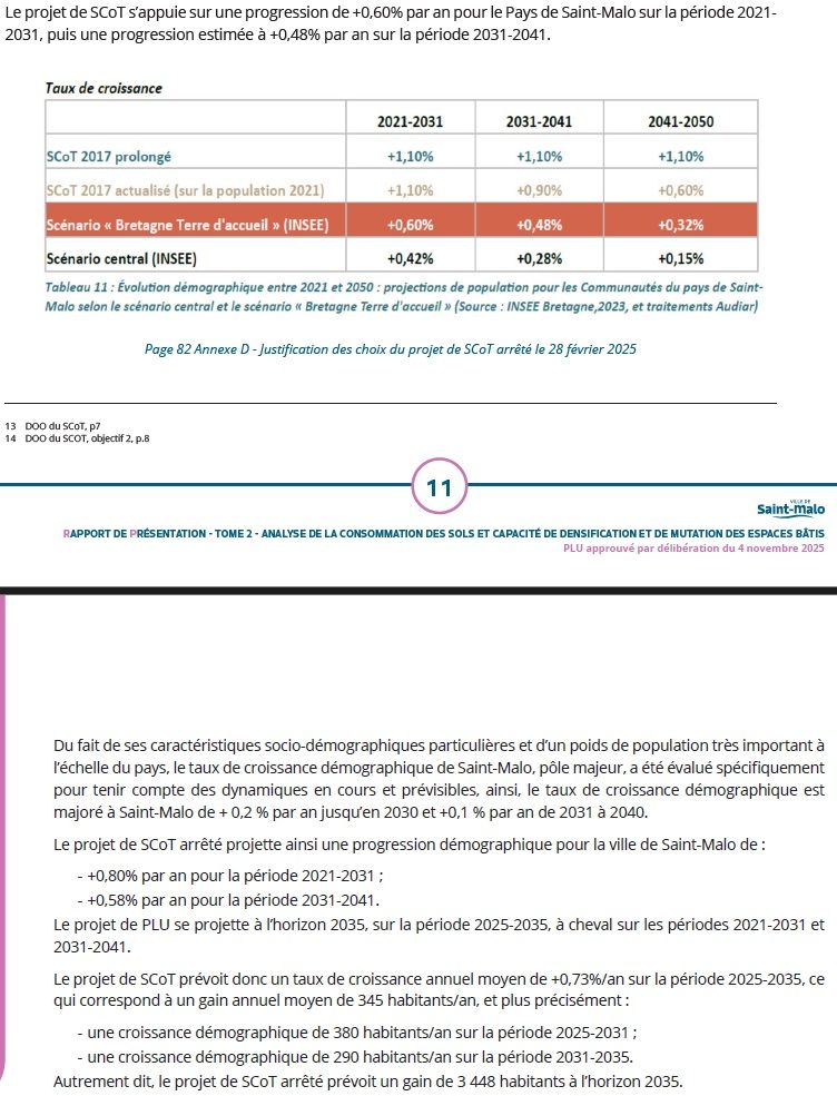 Le SCoT 2025 précise une hypothèse démographique spécifique à la ville de Saint Malo dans l’annexe D - Justification des choix – page 85 :
