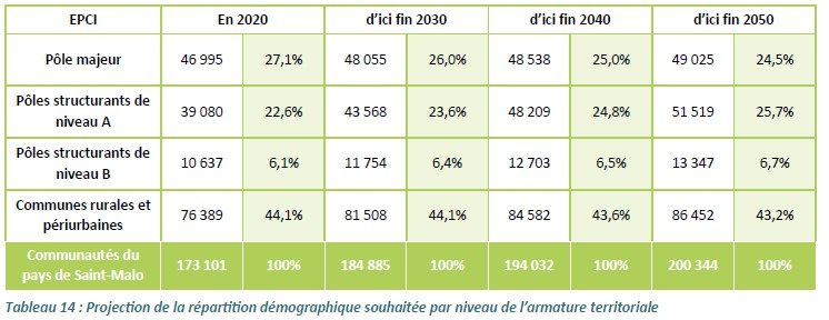 «Du fait de ses caractéristiques socio-démographiques particulières et d’un poids de population très important à l’échelle du pays, le taux de croissance démographique de Saint-Malo, pôle majeur, a été évalué spécifiquement pour tenir compte des dynamiques en cours et prévisibles : + 0,2 % par an jusqu’en 2030 et +0,1 % par an de 2031 à 2040 puis maintien de la population. »