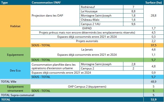 Pour ce « besoin » en logement ( et d’autres besoins qu’on ne développera pas ), le PLU planifie la destruction de 54 ha d’espaces naturels et agricoles. Le détail peut être trouvé page 73 du Tome 2 Consommation des sols et densification :